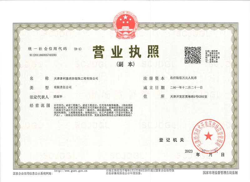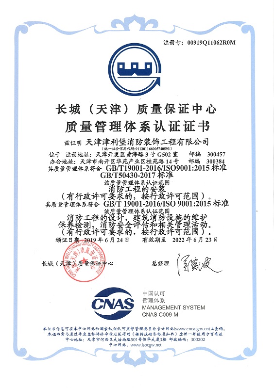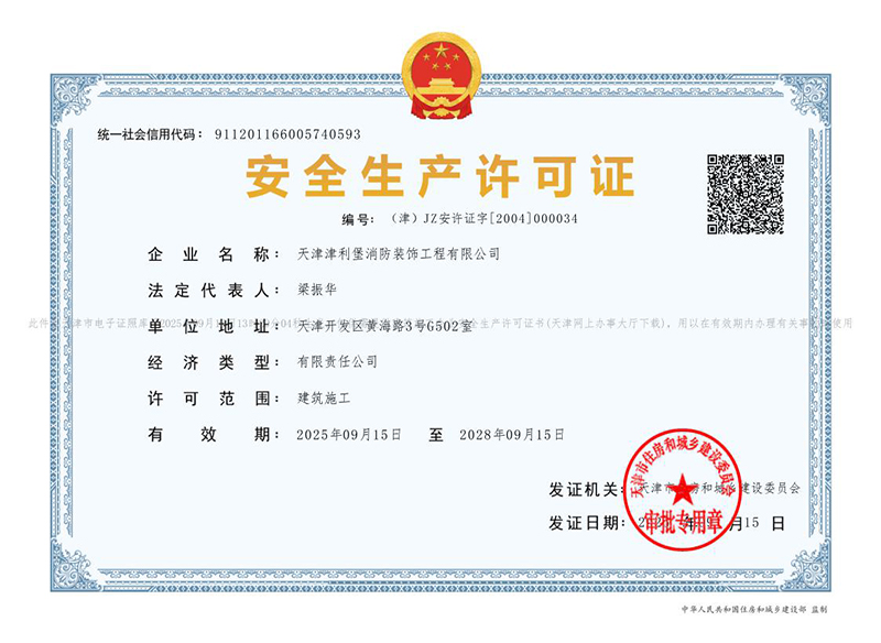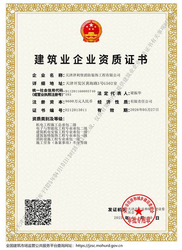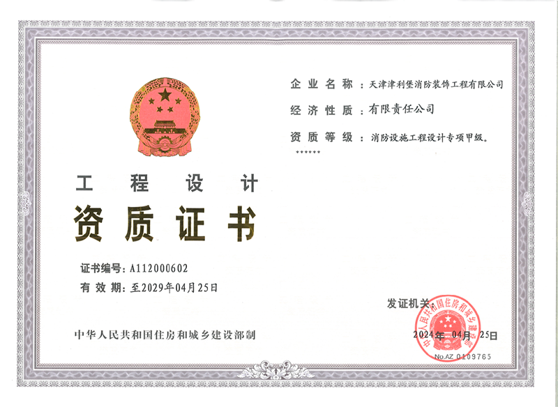 天津津利堡消防裝飾工程有限公司是注冊于天津經濟技術開發區、具有獨立企業法人資格的工程公司,是專門從事消防系統的設計、安裝、供貨、維修、保養及咨詢服務的現代化企業。具有建設部頒發的消防行業最高等級資質:消防設施工程專業承包壹級資質、消防設施工程設計專項甲級資質,同時具有建筑裝修裝飾工程專業承包壹級資質、建筑機電設備安裝工程專業承包壹級資質、電子與智能化工程專業承包貳級資質、機電工程施工總承包貳級資質、施工勞務(備案事項)不分等級資質,符合應急管理部發布的《消防技術服務機構從業條件》,消防設施維護保養檢測及消防安全評估的相關信息已錄入應急管理部的社會消防技術服務信息系統,并取得電氣裝置消防安全檢測資質。